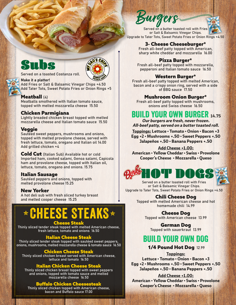 - Appetizers: Begin your meal with crispy mozzarella sticks or indulge in mouthwatering chili & cheese dogs.